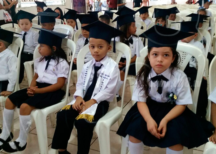 Luciendo con elegancia el uniforme azul y blanco con su birrete, más de 100 niños de la modalidad de preescolar del colegio Rubén Darío recibieron con alegría su diploma de promoción.