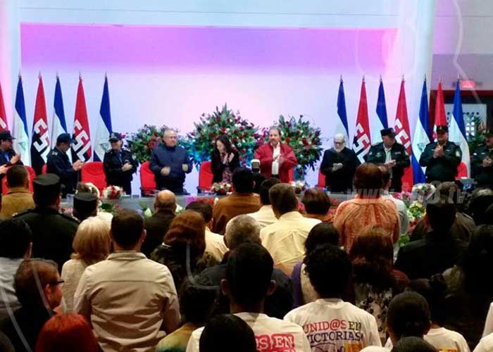 "Nos honra poner en su pecho la orden Augusto C. Sandino al padre Uriel Molina, nuestro saludo a Blanca Segovia y aquí a los nietos del General y todos nosotros familias nicaragüenses a buena honra hijas e hijos de Sandino y de Darío", dijo el presidente Daniel.