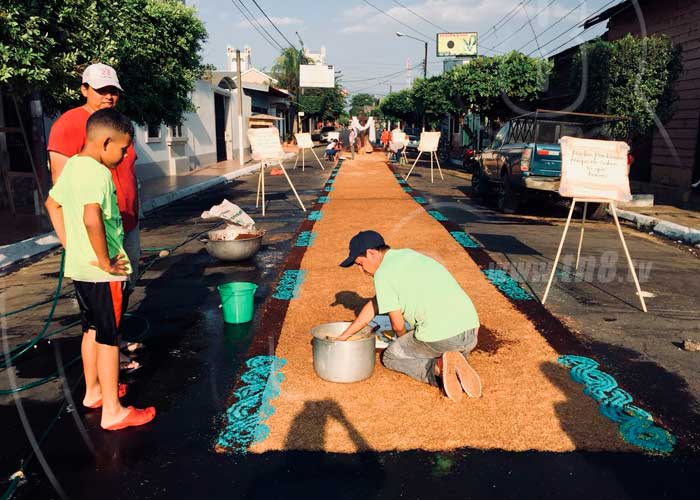 Bajo el ardiente sol del medio día, familias Chinandegas, se dieron a la tarea de elaborar las tradicionales alfombras pasionarias, en las principales calles donde pasará la procesión del Santo Entierro.