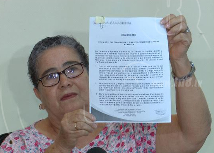 En el escrito leído por la diputada Antonia Vílchez, la Comisión de Asuntos Laborales y Gremiales expresa su respaldo al Diálogo Nacional y al restablecimiento de la paz en Nicaragua.