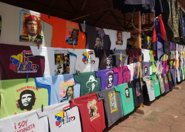 Este trabajador por cuenta propia, manifiesta que el comercio se activa en gran medida para el 19 de Julio, puesto que los sandinistas de corazón año con año actualizan sus camisetas y otros accesorios alusivos al triunfo de la Revolución Popular Sandinista.