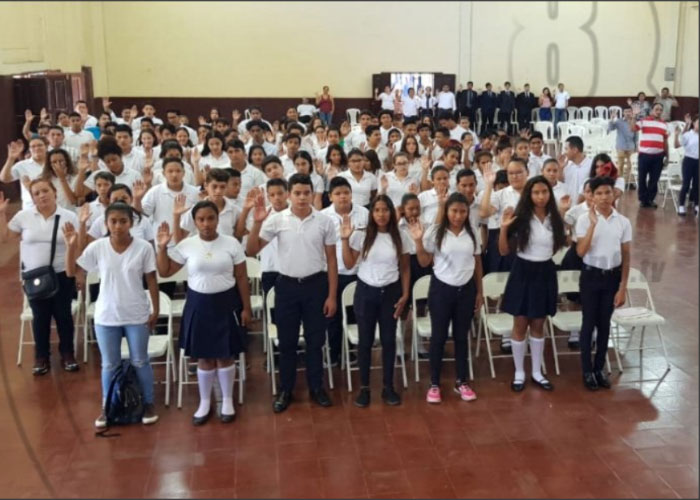 “Prometéis solemnemente ante Dios, la Patria y los mártires, respetar, honrar y defender nuestra bandera azul y blanco, símbolo de nuestra independencia, libertad y soberanía, si así lo hiciera que la patria los premie”, comunicó la directora del colegio 14 de Septiembre, Tamara Arroliga.