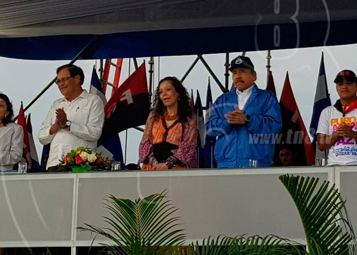 Muy buenas tardes Nicaragua; estimado Señor Presidente de la República, Compañero Comandante Daniel Ortega Saavedra; estimada Compañera Vicepresidenta, Compañera Rosario Murillo; estimado Canciller de Nicaragua, Denis Moncada; estimada Vicecanciller Arlette Marenco; estimados Funcionarios del Gobierno de Nicaragua; Compañero Milthon Ruiz, Coordinador Nacional de la Juventud; queridos Jóvenes; mi estimada y querida esposa Vicenta; querido Pueblo de Nicaragua; queridos Compañeros Compatriotas salvadoreños residentes en este Hermano País.