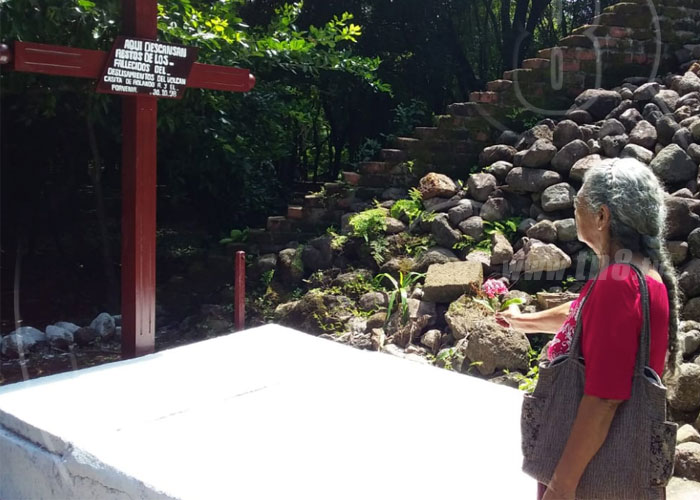 Cristobal Gradys, Secretario del Concejo Municipal de la Alcaldía de Posoltega, junto a otros personas depositaron este martes ofrendas florales en el Parque Memorial dedicado a las víctimas.