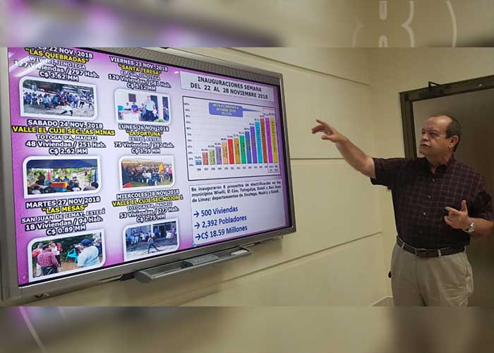 “Nos vamos a Managua cerca de Carretera Vieja León en Chiquilistagüa sector los Rocha ahí hablamos de 38 viviendas y 199 hermanos y hermanas con acceso a la energía eléctrica y después pasamos a León el Jicaral Santa Cruz Ahí hablamos de 31 viviendas y 162 de hermano y hermana con acceso a la energía eléctrica, luego para irnos a Madrid ya tenemos 18 viviendas y 78 hermanos y hermanas con acceso a la energía eléctrica después nos vamos a Caribe Norte en Waspán, ahí está instalada una planta a base de diésel eso limitaba a la población con la energía, ahí tenemos el gran proyecto esa línea que se va a conectar al sistema interconectado nacional”, sostuvo.