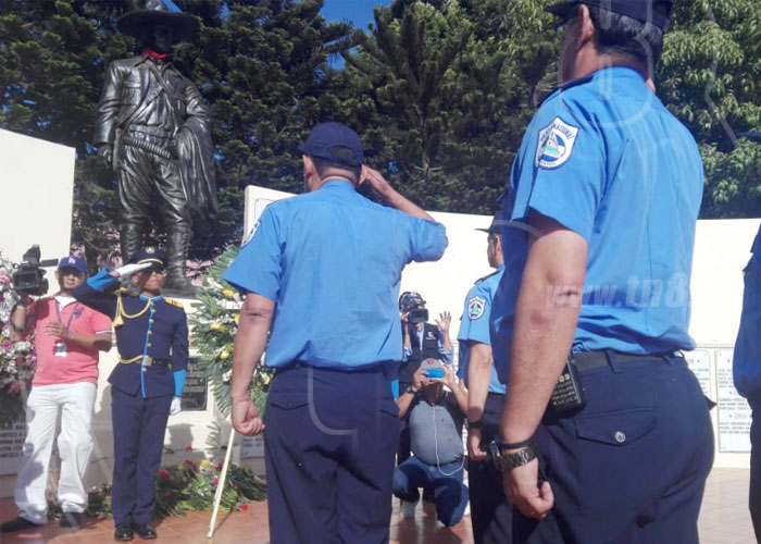 “El General Sandino vive en el corazón y el pensamiento de todos nuestros policías”, fueron las palabras del Comisionado General Francisco Díaz, director de la Policía Nacional, la mañana de este jueves en Plaza El Sol, donde la institución del orden público rindió homenaje al General de Hombres y Mujeres Libres, Augusto C. Sandino, colocando ofrendas florales en su monumento.