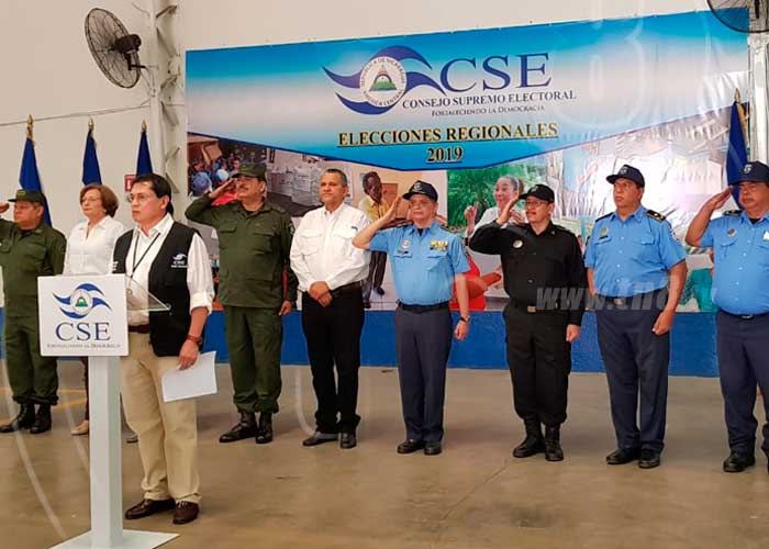 "En cumplimiento, creando condiciones del plan que garantiza las condiciones en el territorio, brindar seguridad a la transportación y funcionarios en los 15 municipios de ambas regiones, 1,500 efectivos militares, 45 vehículos de carga, 30 vehículos ligeros, 52 medios navales 3 medios aéreos y 110 medios de comunicación", indicó el general de brigada, Juan José Membreño, jefe de la Dirección de Operaciones y Planes del Ejército de Nicaragua.