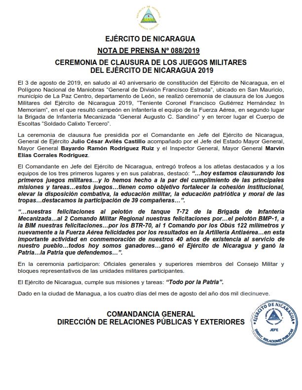 “…nuestras felicitaciones al pelotón de tanque T-72 de la Brigada de Infantería Mecanizada…al 2 Comando Militar Regional nuestras felicitaciones por…el pelotón BMP-1, a la BIM nuestras felicitaciones…por los BTR-70, al 1 Comando por los Obús 122 milímetros y nuevamente a la Fuerza Aérea felicidades por los resultados en la Artillería Antiaérea…en esta importante actividad en conmemoración de nuestros 40 años de existencia al servicio de nuestro pueblo…todos hoy somos ganadores…ganó el Ejército de Nicaragua y ganó la Patria…la Patria que defendemos…”.