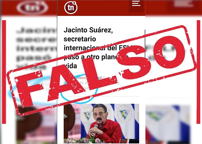 A través de una burdo montaje fotográfico utilizando la apariencia de nuestro sitio web tn8.tv, medios irresponsables divulgan la falsa noticia del fallecimiento del Secretario de Relaciones Internacionales del FSLN, Jacinto Suárez.