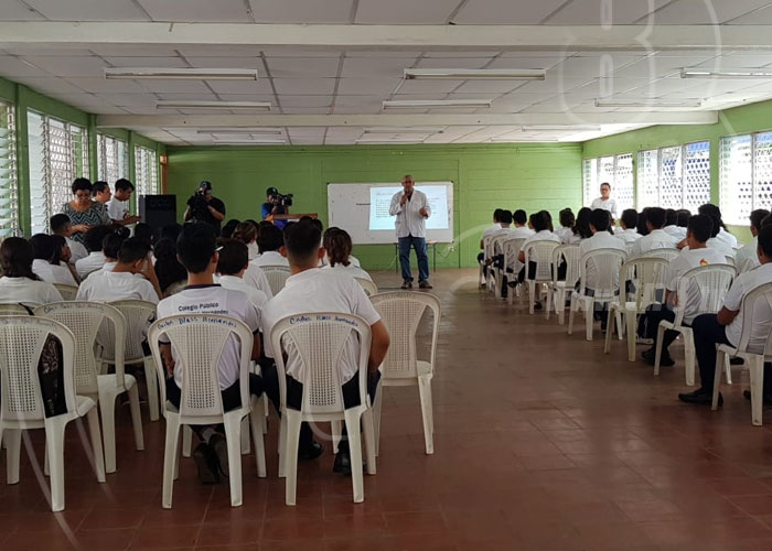 Los alumnos del colegio público Alejandro Blass Hernández, que se ubica en el distrito 6 de Managua, escucharon con atención la exposición de médicos del sistema público de salud que dieron detalles de las medidas para enfrentar la pandemia.