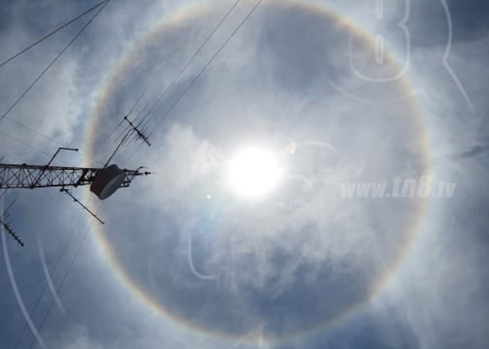 El calor abrumador que todavía está pegando fuerte en estos días de mediados de mayo en Nicaragua, se volvió todavía más curioso este jueves al verse un extraño halo alrededor del sol, lo que ha dejado perplejos a propios y extraños.