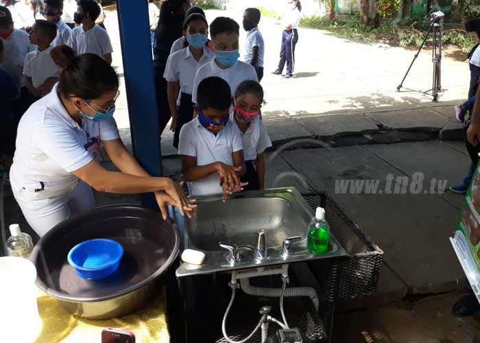 "Hoy vamos a ratificar ante nuestro pueblo, ante la educación del país que los niños y las niñas están cada días preparados para salvaguardar su vida y salvaguardar sus vidas significa lavarse las manos todos los días con agua y jabón", compartió Perfecto Arróliga, director del colegio Modesto Armijo.