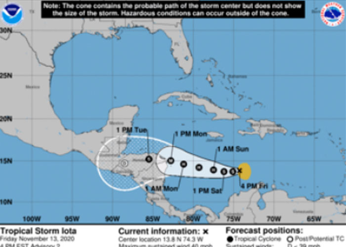 El Centro Nacional de Huracanes de Estados Unidos ha informado a eso de las 3:00 pm de este viernes 12 de noviembre, que la Tormenta Tropical Iota se ha formado en el Mar Caribe, la cual debe ser monitoreada de cerca por Nicaragua y Honduras.