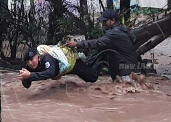 Un oficial de la Dirección de Operaciones Especiales de la Policía Nacional rescató a un niño en medio de las fuertes inundaciones registradas en el municipio El Cuá, comunidad Santa Lucía, en Jinotega.