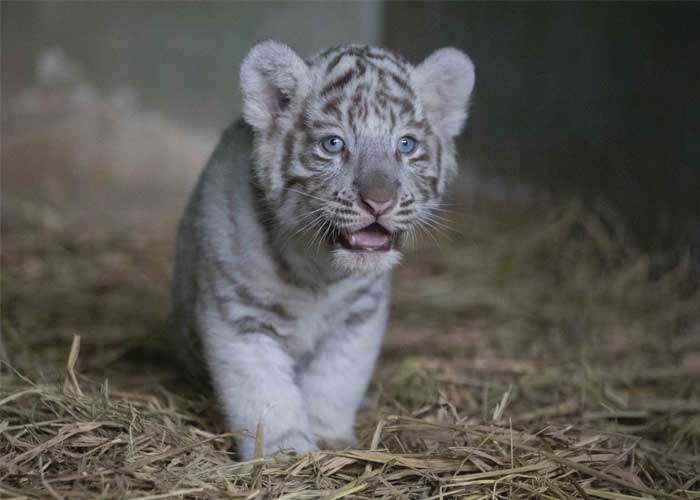 Los cachorros de color blanco están marcados por una condición genética que elimina el pigmento del tradicional pelaje anaranjado de estos tigres, originarios del sureste asiático, sin afectar sus distintivas rayas negras.