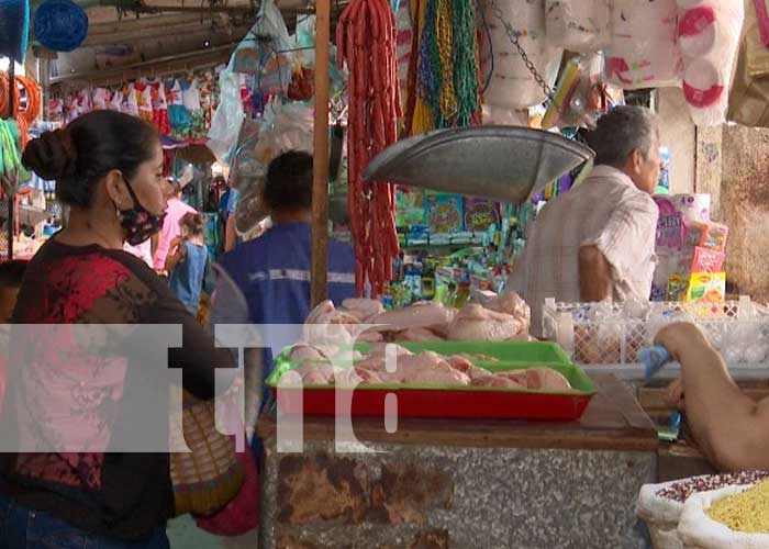 El arroz se cotiza a 18 córdobas la libra; el aceite a 54 córdobas el litro; el azúcar a 14 córdobas la libra; los frijoles rojos a 32 córdobas la libra; el maíz blanco a 10 córdobas la libra; la posta de res 117.33 de córdobas; pierna de pollo tiene un precio de 53.86 centavos la libra, pierna con muslo 46 córdobas.