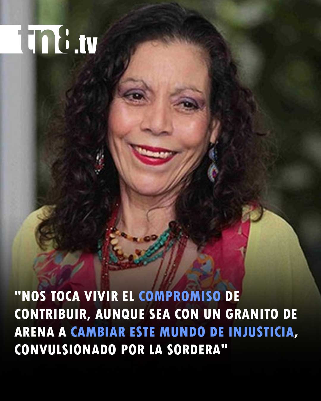 Cada día nos toca vivir el compromiso de contribuir, aunque sea con un granito de arena, a cambiar este Mundo de injusticia, convulsionado por la injusticia, convulsionado por la sordera, convulsionado por la negativa a reconocer los Derechos de Tod@s. A tratarnos como Herman@s, como Prójimo»; expresó la Vicepresidenta de Nicaragua, Rosario Murillo en su comunicación de hoy hacia las familias del país.