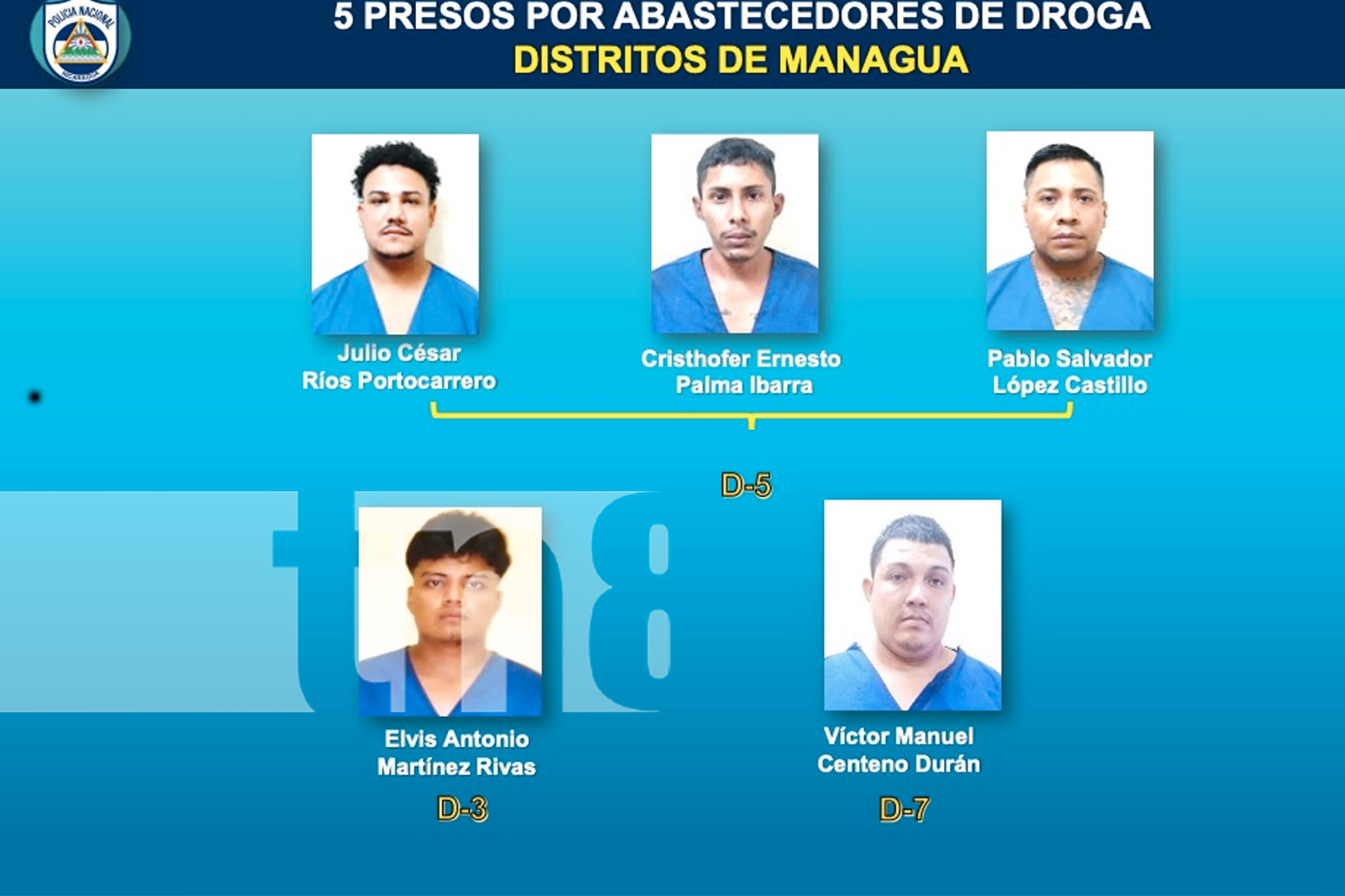 La Policía Nacional detuvo a cinco individuos por abastecimiento de drogas y los envió tras las rejas en distintos distritos de Managua. En el distrito 5, la Policía arrestó a Julio César Ríos Portocarrero, Cristofer Ernesto Palma Ibarra y Pablo Salvador López Castillo. En el distrito 3, capturó a Luis Antonio Martínez Rivas, y en el distrito 7, a Víctor Manuel Centeno Durán. Durante estos operativos, se incautaron 7 libras con 207 gramos de marihuana, 273 gramos de cocaína, 41 gramos de crack, un automóvil, una motocicleta, un teléfono celular y dinero en efectivo.