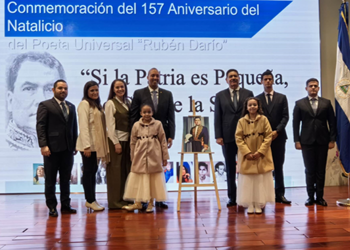 Habló del carácter universal del pensamiento y obra de nuestro Héroe Nacional Rubén Darío, su convicción independista, antiimperialista y su firme compromiso con la Unidad Nuestro-americana y Caribeña. Destacó además la faceta diplomática de Darío, dado representó a Nicaragua en varias misiones internacionales.