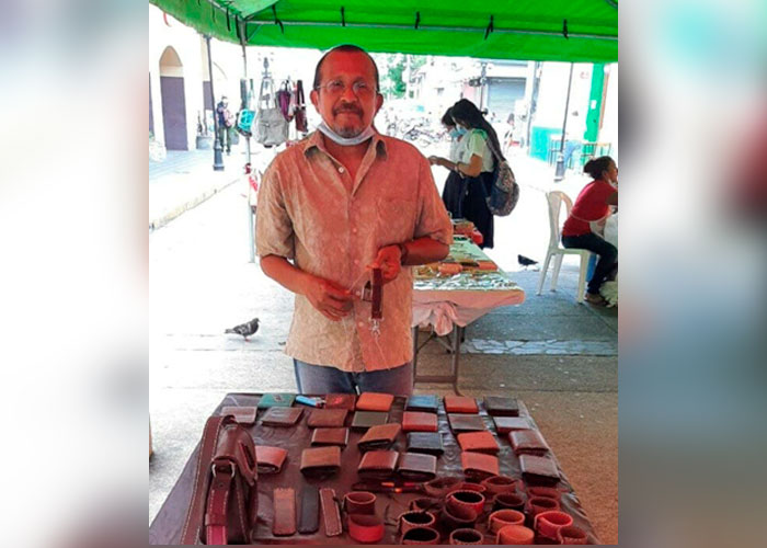 “Soy originario de aquí de León. Hago artículos de cuero a mano, bolsos, carteras, carteras, carteras; utilizando materiales fabricados en Nicaragua’; explica Luis