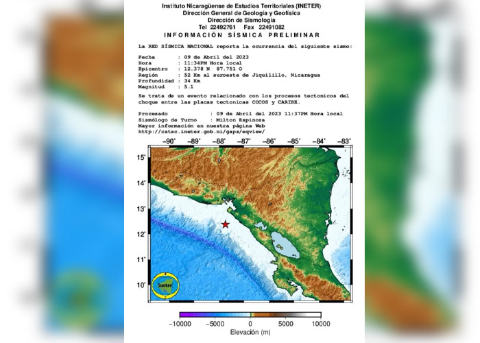 A eso de las 11:34 de la noche del domingo, en cierre de la Semana Santa se registró un fuerte temblor en la región, 52 km al suroeste de Jiquilillo, Nicaragua, con profundidad de 34 km, magnitud 5.1.