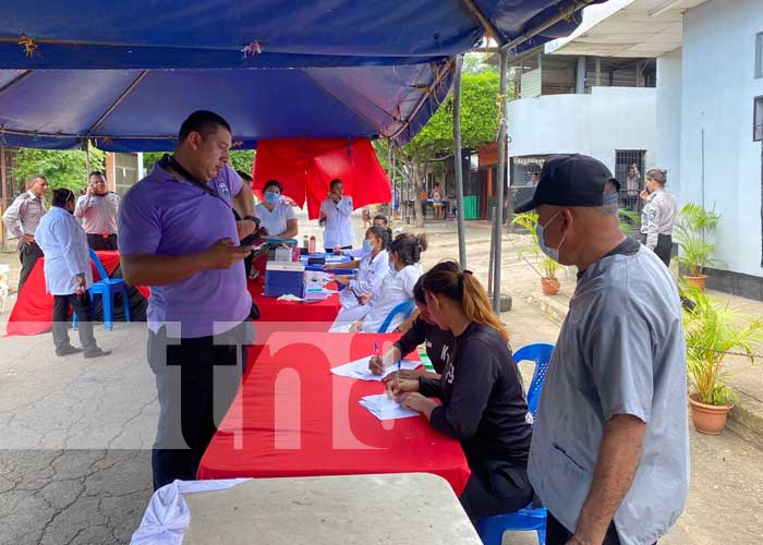 Durante la actividad desarrollada en las afueras del sistema penitenciario del municipio de Chinandega, las familias asistían con sus mascotas y también algunos recibían atenciones de salud como chequeo de presión.