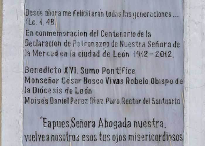 Fue hasta el 17 de julio de 1912 que el obispo Simeón Pereira y Castellón declaró “PATRONA de la Ciudad de León con el vivo deseo de que de esta manera se acreciente más su devoción…” (decreto emitido en la fecha indicada, citado por Nicolás Buitrago Matus en su obra: León, la sombra de Pedrarias. Tomo I. Managua, Fundación Ortiz Gurdián, junio, 1998, pp. 127-128). Además, en el atrio de la iglesia de La Merced el obispo Bosco Vivas colocó una gran placa conmemorativa del Centenario de la declaración de ese patronazgo el 17 de julio de 2012. Agradezco a Miguel Ángel Martínez la fotografía de esa placa. Se trata de una elocuente prueba del error cometido por el licenciado Guido, entre otros que señalaré oportunamente. La verdad histórica está por encima de cualquier interés.