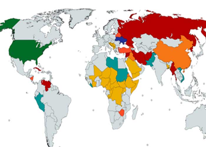 El mapa muestra países sometidos de alguna manera a medidas coercitivas unilaterales por parte de Estados Unidos. El rojo indica sanciones amplias contra el país; rojo naranja, algunos o todos los funcionarios del gobierno son sancionados (incluye Nicaragua); amarillo, se sanciona a “las personas que contribuyen al conflicto y la desestabilización del país”; azul, “personas que socavan la soberanía de un país”; turquesa, indica sanciones anteriores; y el color naranja recortado significa que “los funcionarios que contribuyen al conflicto” están sancionados. (Creador: Jojoto Rudess)