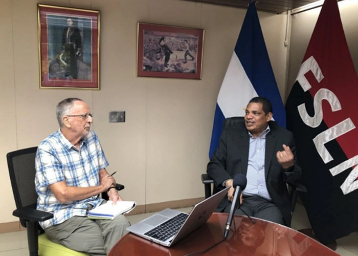 El ministro de Finanzas, Iván Acosta (derecha), le dice a John Perry que Nicaragua tiene una excelente reputación a nivel mundial por completar proyectos y rendir cuentas del dinero que recibe.