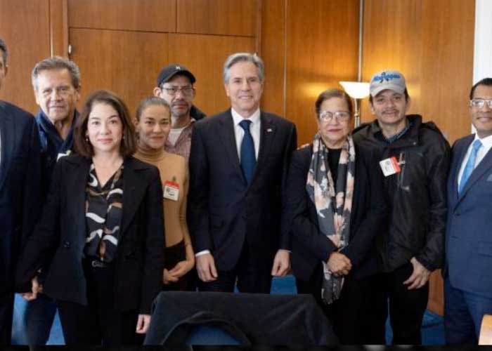 Foto tuiteada por el Secretario de Estado Antony Blinken el 24 de febrero de 2023. De izquierda a derecha: Juan Sebastián Chamorro, Arturo Cruz, Victoria Cárdenas, Tamara Dávila, Pedro Mena, Secretario de Estado de los Estados Unidos Antony Blinken, Violeta Granera, Medardo Mairena, Felix Maradiaga . Cuatro de estas personas están comprendidas en el presente artículo.