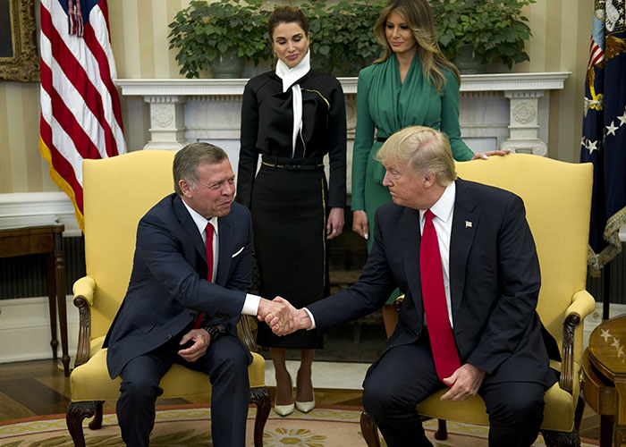Hacia el mediodía, el rey Abdalá llegó a la Casa Blanca acompañado de su esposa, la reina Rania, y fueron recibidos fuera del ala oeste por Trump y la primera dama estadounidense, Melania.