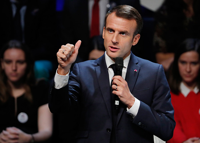 Macron, cuya popularidad está cayendo, habló en un debate universitario en Bélgica, donde algunos estudiantes desplegaron pancartas y lanzaron papeles en el auditorio.