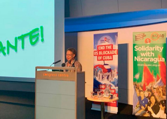 Durante el encuentro, tanto la doctora Levy como la embajadora de Nicaragua ante Reino Unido y compañeros de la solidaridad en diferentes seminarios y talleres, denunciaron el fallido golpe, la injerencia de los Estados Unidos, expusieron los avances y logros del Gobierno Sandinista y su resistencia a las políticas neoliberales, especialmente los esfuerzos por el desarrollo y reducción de la pobreza, enfatizando los derechos restituidos a las poblaciones de nuestra Costa Caribe y la igualdad de género y manifestaron la solidaridad del pueblo nicaragüense con los pueblos y Gobiernos de Cuba y Venezuela.