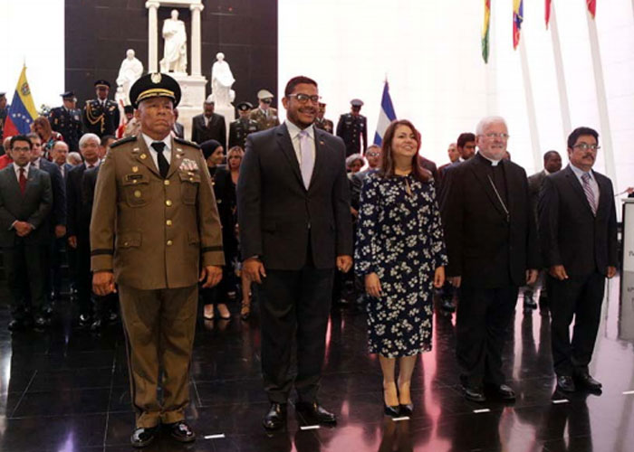 El acto contó con la presencia del Viceministro para América Latina, Compañero Rander Peña, el Nuncio Apostólico Monseñor Aldo Giordano, representantes del cuerpo diplomático y de instituciones del Estado, así como miembr@s del Comité de Solidaridad de Venezuela con Nicaragua, movimientos sociales y Prensa Nacional.