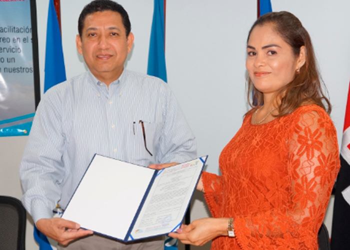 La entrega del certificado fue realizada por el Director General Cap. Carlos Salazar Sánchez a la Compañera Aleyda Molina, Gerente General del Aeropuerto Augusto César Sandino.