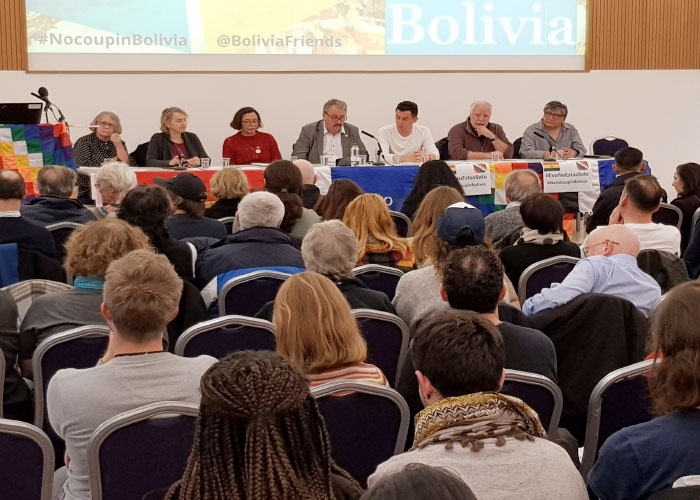 De la misma forma, los Oradores Kate Hudson de la Campaña por el Desarme Nuclear; Lindsey German, de Stop The War Coalition; Marcus Barnett, de Juventud Laborista, Manuel Bueno, Sindicalista boliviano, y Javier Sánchez, de la agrupación comunitaria boliviana SUMA QAMANA, condenaron el Golpe de Estado perpetrado contra el Presidente Constitucional de Bolivia, Evo Morales, y llamaron a solidarizarse con el Pueblo de ese Hermano País Suramericano.