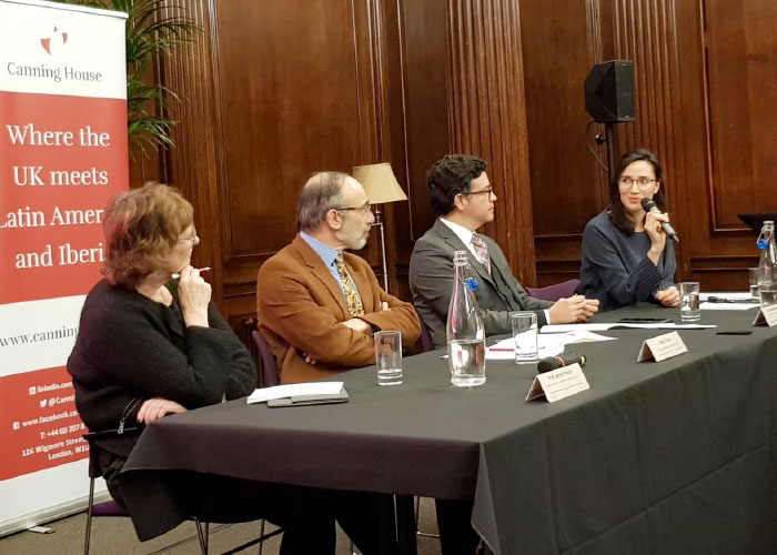 Los integrantes del Panel fueron : El Señor Elkin Velásquez, Director para Latinoamérica y el Caribe del Programa de Asentamientos Humanos de las Naciones Unidas; la Profesora Jenny Pearce, de la Escuela Londinense de Economía, y Lucía López Esquivelzeta, de la Empresa Control Risks, que asesora a Empresas británicas que buscan operar en el Exterior.