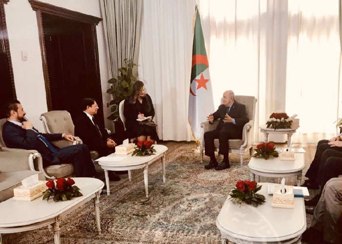 El Presidente de la República Argelina Democrática y Popular, Compañero Abdelmadjid Tebboune, recibió ayer Lunes 9 de Marzo de 2020, a la Delegación de Nicaragua, con la presencia de los Compañeros, Ministro de Relaciones Exteriores, Sabre Abu Qadoum, Jefe del Diwan (Palacio Presidencial), Noureddine Daig, y el Ministro Consejero de Comunicación, Portavoz de la Presidencia de la República, Belaid Mohand Oussaid y otros Altos Funcionarios de la Presidencia y la Cancillería de Argelia.