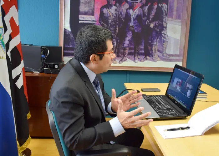 El Embajador de Nicaragua en España, Compañero Carlos Midence, en representación del Gobierno de Reconciliación y Unidad Nacional, sostuvo el día de hoy, reunión virtual con Pascual Serrano, reconocido Periodista, Comunicólogo y Ensayista español.