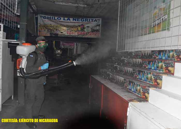 Efectivos militares de la Unidad Humanitaria y de Rescate “Comandante William Ramírez Solórzano” del Ejército de Nicaragua, en coordinación con las autoridades del Ministerio de Salud (MINSA) y la Corporación Municipal de Mercados de Managua (COMMEMA), realizaron jornada de desinfección de espacios públicos en el municipio de Managua, rociando con cloro y agua en los siguientes lugares: