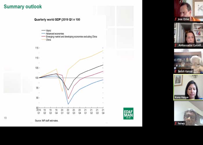 El Director Ejecutivo de esta organización, Señor José Urib y la Señora Kona Hague, Jefe de Investigación de ED & F Man, una de las firmas de comercio de materias primas más reconocidas del mundo, hicieron un análisis exhaustivo de factores relevantes de los Mercados Internacionales, las perspectivas macroeconómicas, el comportamiento de los inversores y las respuestas de los Gobiernos para enfrentar la Pandemia, presentando una imagen completa de la situación y las perspectivas futuras del mercado internacional del azúcar y otros productos.