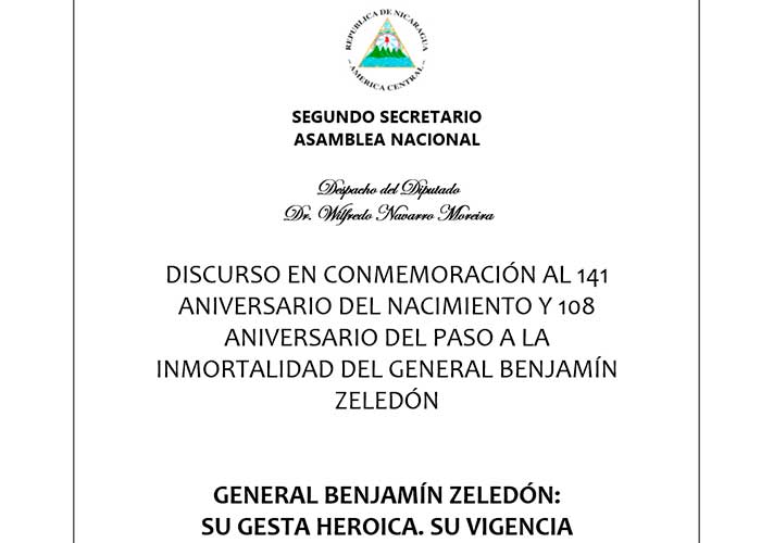 Que retumben a 141 años de su nacimiento y a 108 años de su tránsito a la inmortalidad, el pensamiento y las palabras del General Benjamín Zeledón. Para que los nicaragüenses pensemos en la patria, en el bienestar nacional. Y que las divisiones, las luchas intestinas, las ambiciones rastreras no promuevan nuevamente que los extranjeros intervengan en los asuntos internos del país y decidan sobre el destino de nuestra Nicaragua. Y que más nunca las botas del invasor pisen y mancillen el sagrado suelo patrio.