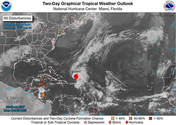 Por orientaciones del Presidente de la República Comandante José Daniel Ortega Saavedra, las Codirecciones del Sistema Nacional para la Prevención, Mitigación y Atención de Desastres, en el uso de las facultades conferidas por la Ley 337, “Ley Creadora del Sistema Nacional para la Prevención, Mitigación y Atención de Desastres” (SINAPRED) y su Reforma Ley 863, en su arto 3 numeral 2, articulo 15, inciso 1, 2, 3 y 4, artículos 16, 28, 30, 31 y su reglamento Decreto 53-2000 artículos 9 y 10 y Decreto 88-2007, Arto 2, 16 inciso f, informan a la población nicaragüense y a las instituciones que integran el Sistema Nacional para la Prevención, Mitigación y Atención de Desastres (SINAPRED), que de acuerdo al boletín número cinco del INETER, se informa de un centro de bajas presiones atmosféricas localizado esta mañana de lunes 23 de octubre, sobre el Suroeste del Mar Caribe, muy próximo a las costas del Caribe (cercano a Laguna de Perlas), se desplaza hacia el Oeste/noroeste con 7 kph y genera vientos máximos sostenidos de 54 kph.