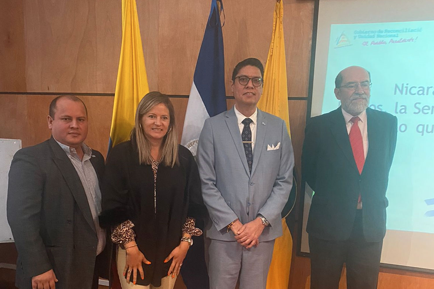 En la actividad ofreció palabras de bienvenida el Decano de la Facultad de Derecho Doctor Luis Díaz Gamboa. El Compañero Harold Delgado, Embajador de la República Nicaragua en Colombia, trasmitió los saludos del Presidente-Comandante Daniel Ortega y de la Vicepresidenta Compañera Rosario Murillo.