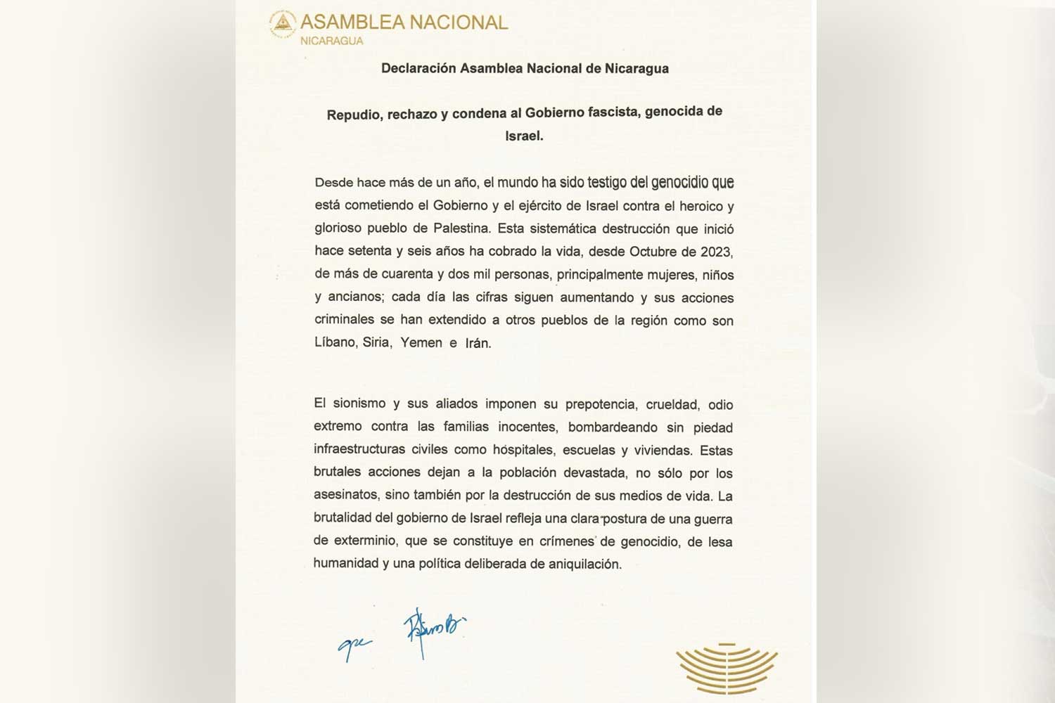 La Asamblea Nacional de Nicaragua emitió una contundente declaración en la que condena el genocidio que el gobierno de Israel perpetra contra el pueblo palestino y otras naciones del Medio Oriente.