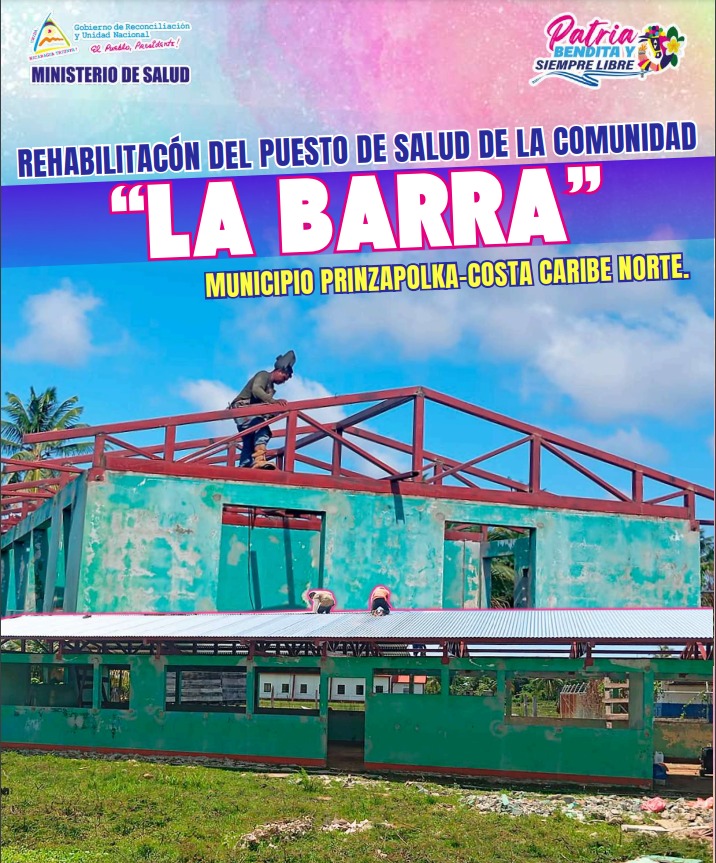 Actualmente, se realizan obras de Rehabilitación y Equipamiento del Puesto de Salud de la Comunidad “La Barra”, Municipio de Prinzapolka-Costa Caribe Norte; lo que nos permitirá atender en mejores condiciones a 1,700 protagonistas quienes pertenecen al Pueblo Miskitus y habitan en tres Comunidades de esta localidad.
