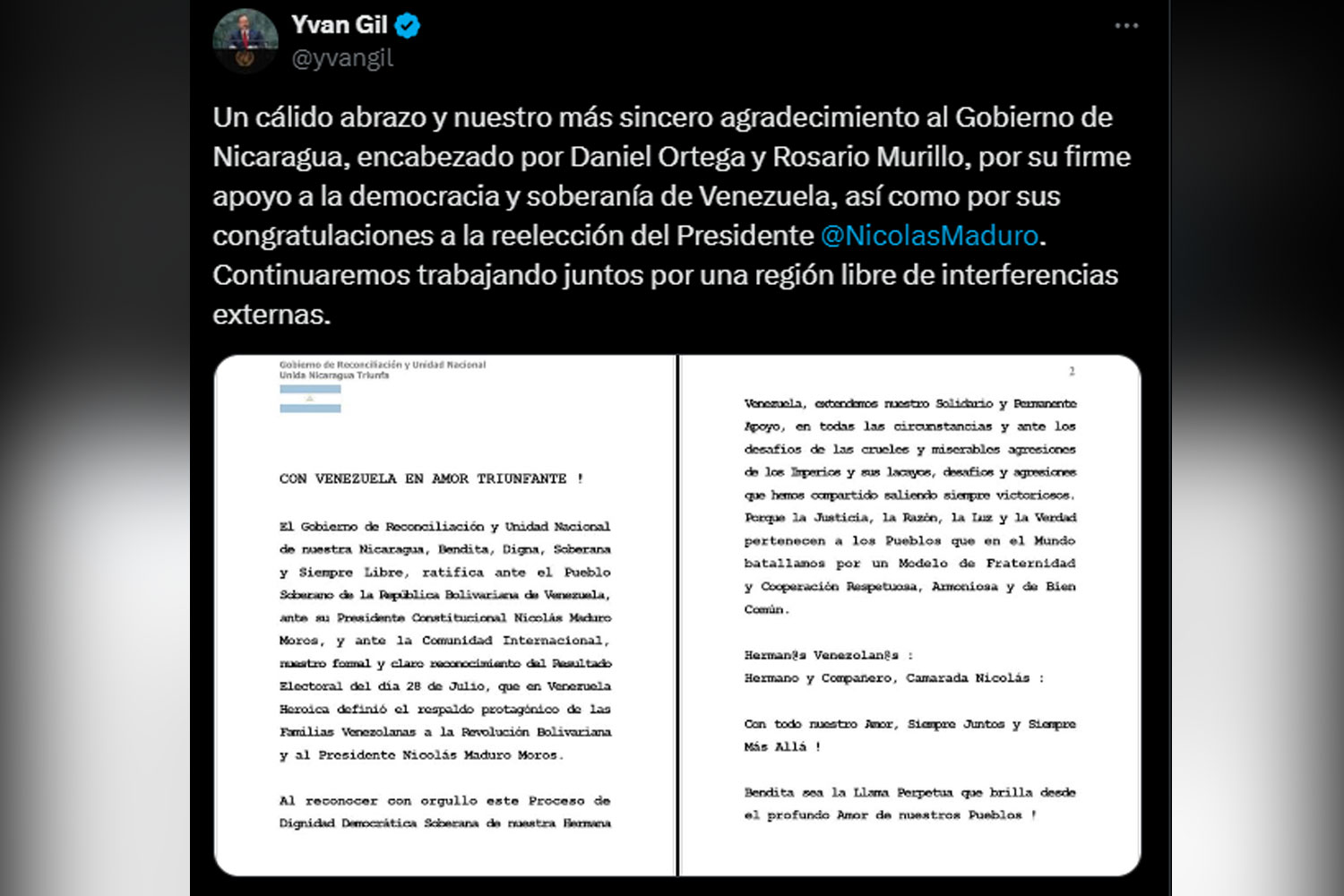 «Un cálido abrazo y nuestro más sincero agradecimiento al Gobierno de Nicaragua, encabezado por Daniel Ortega y Rosario Murillo, por su firme apoyo a la democracia y soberanía de Venezuela, así como por sus congratulaciones a la reelección del Presidente @NicolasMaduro. Continuaremos trabajando juntos por una región libre de interferencias externas«; afirmó Gil, reiterando el compromiso mutuo entre Venezuela y Nicaragua.
