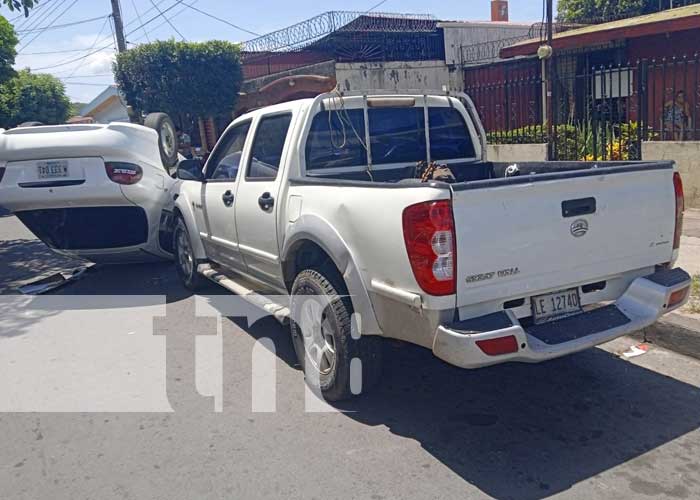 El vehículo volcado es un Hyundai, color blanco, placa M 333-041, e impactó al carro Nissan, color gris, placa M66-434 conducido por Cristopher Villalobos y la otra camioneta color blanco, placa LE 12740, era conducida por María del Carmen Salgado Ríos; quien resulto ilesa.