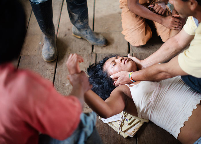 La víctima ve a las demás personas como demonios, mientras no siente dolor en su propio cuerpo cuando se lastima a sí misma al mismo tiempo pierde la memoria de lo que sucede. Algunos toman machetes o botellas rotas para defenderse de atacantes invisibles.? Se dice que incluso algunas víctimas han realizado hazañas sobrehumanas,? vomitado extraños objetos como arañas, cabellos o monedas? y hablado en lenguas diferentes a las locales.