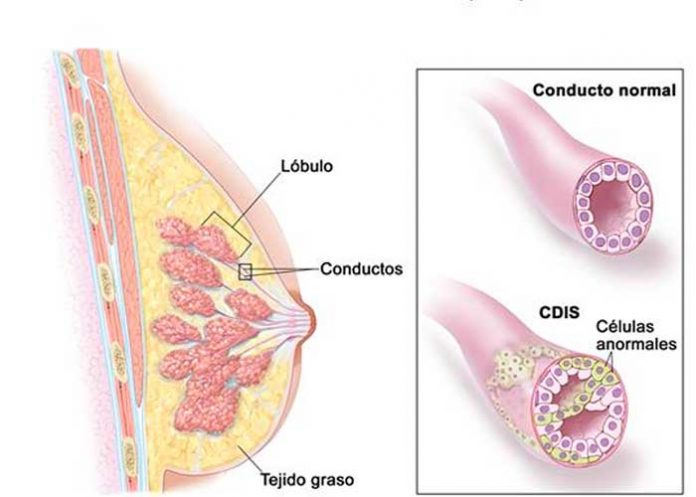 El carcinoma ductal in situ (DCIS) es la presencia de células anormales en el conducto mamario dentro de la mama y se considera que es la forma más temprana del cáncer de mama.
